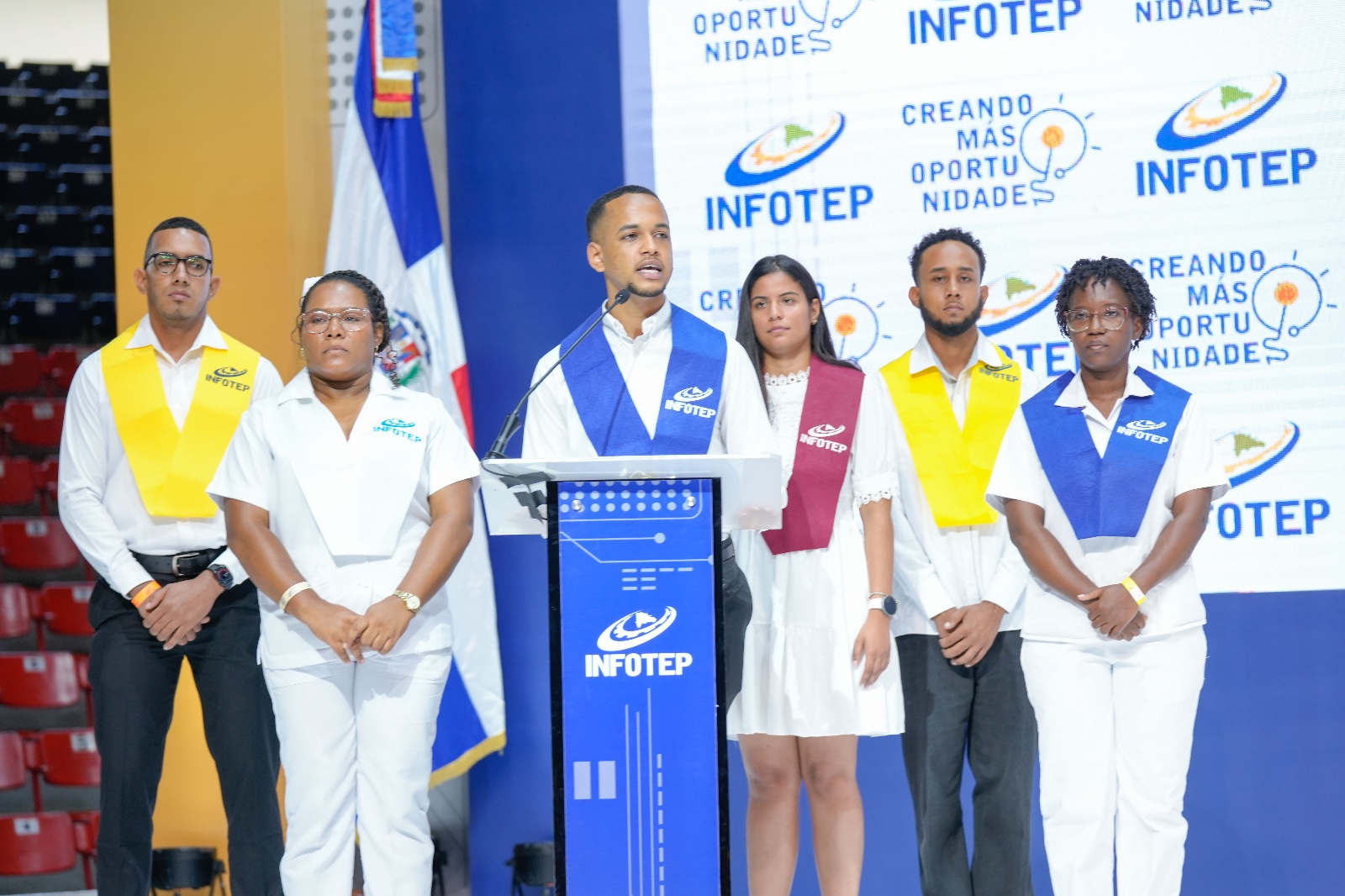 Frente a miles de asistentes, entre graduados y personalidades del ámbito laboral, empresarial y gubernamental, el director del INFOTEP expresó que las aulas y talleres están abiertos, ahora en más lugares que nunca antes, para todos los jóvenes que tienen interés de alcanzar un aprendizaje útil y productivo.