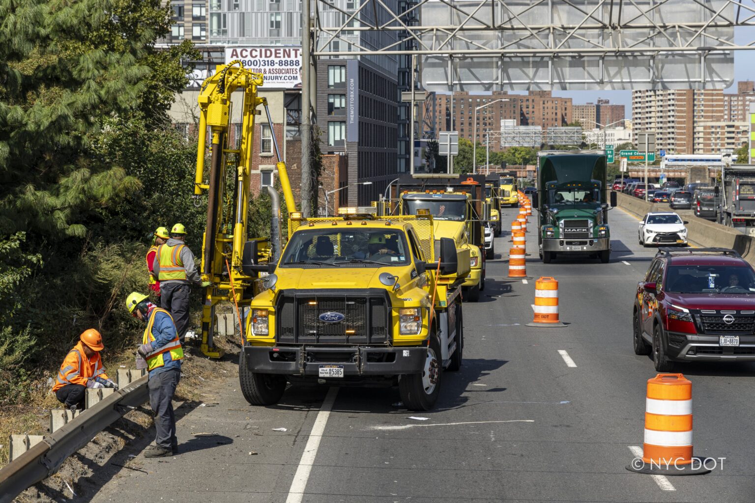 A través de Vision Zero, el NYC DOT adopta un enfoque holístico para mantener a las cuadrillas seguras en los lugares de trabajo, incluso mediante el uso de medidas de control automatizadas dirigidas al exceso de velocidad en las zonas de trabajo; educación y formación internas; y equipos de seguridad como cámaras de visión trasera y marcas retrorreflectantes.