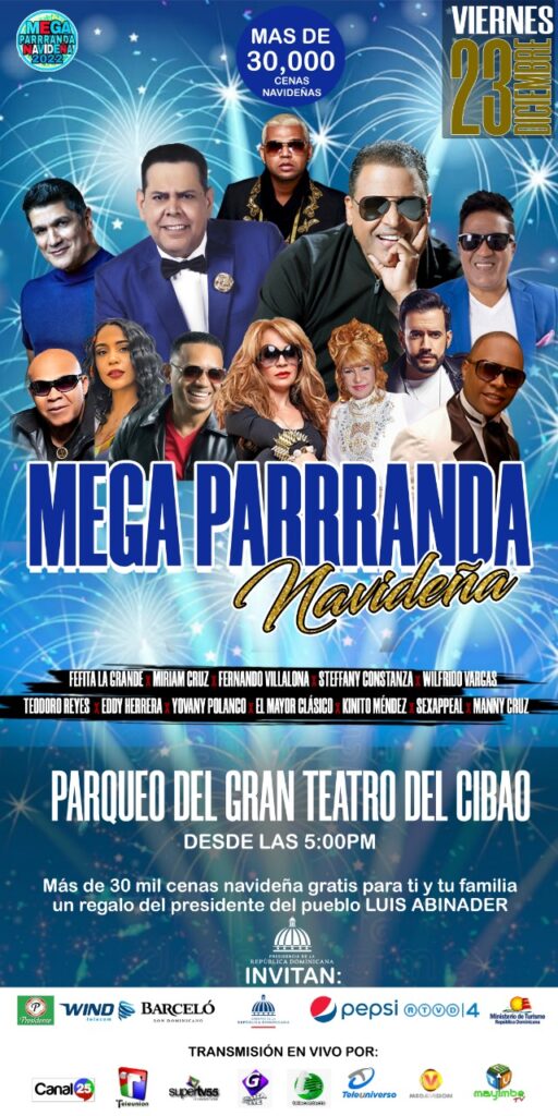 Los números hablan por sí solos: 25 superestrellas, 10 presentadores, 16 horas de música transmitidas por 7 canales de televisión, 60 mil cenas navideñas y muchos premios que desbordarán de alegría y euforia La Mega Parranda Navideña, los días 23 y 31 de diciembre, desde las 5 de la tarde, en la zona monumental del parqueo del Gran Teatro del Cibao en Santiago.