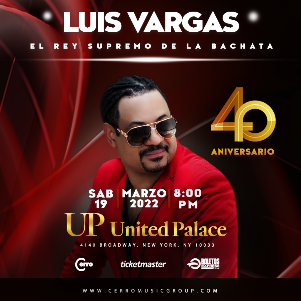 Este sábado 19 de marzo Luis Vargas, el artista dominicano conocido internacionalmente como “El Rey Supremo de la Bachata”, celebrará 40 años de vida artística en el Teatro United Palace de Manhattan.