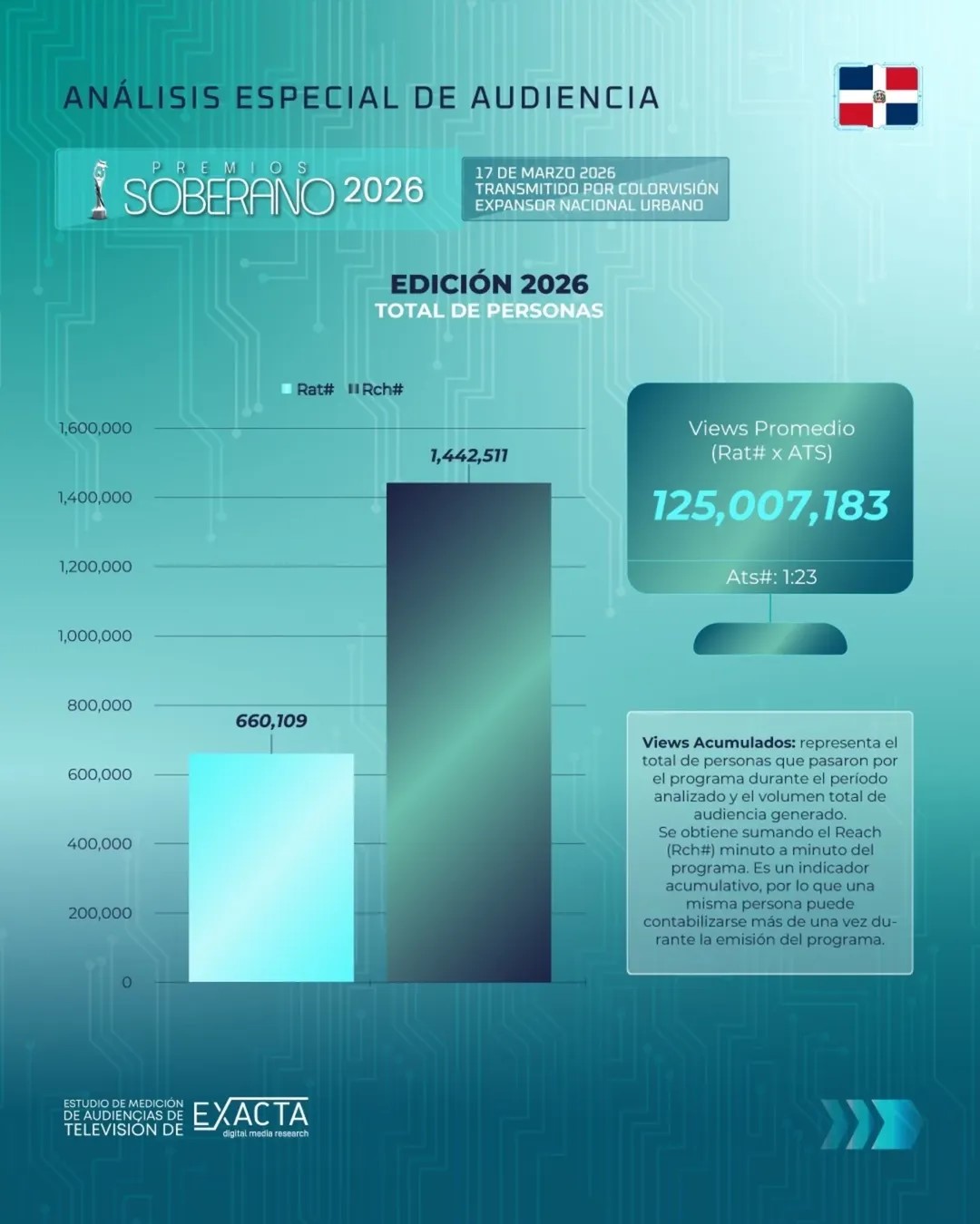De acuerdo con Exacta Digital Media Research, firma de origen chileno especializada en la medición de audiencias multiplataforma en Latinoamérica -incluyendo televisión (rating) y medios digitales-, la gala alcanzó cifras extraordinarias. La empresa, que opera oficialmente en mercados como República Dominicana y Guatemala y utiliza tecnología de punta como Audio Matching para ofrecer datos precisos, certificó a través de su cuenta de Instagram el alcance obtenido por el evento.