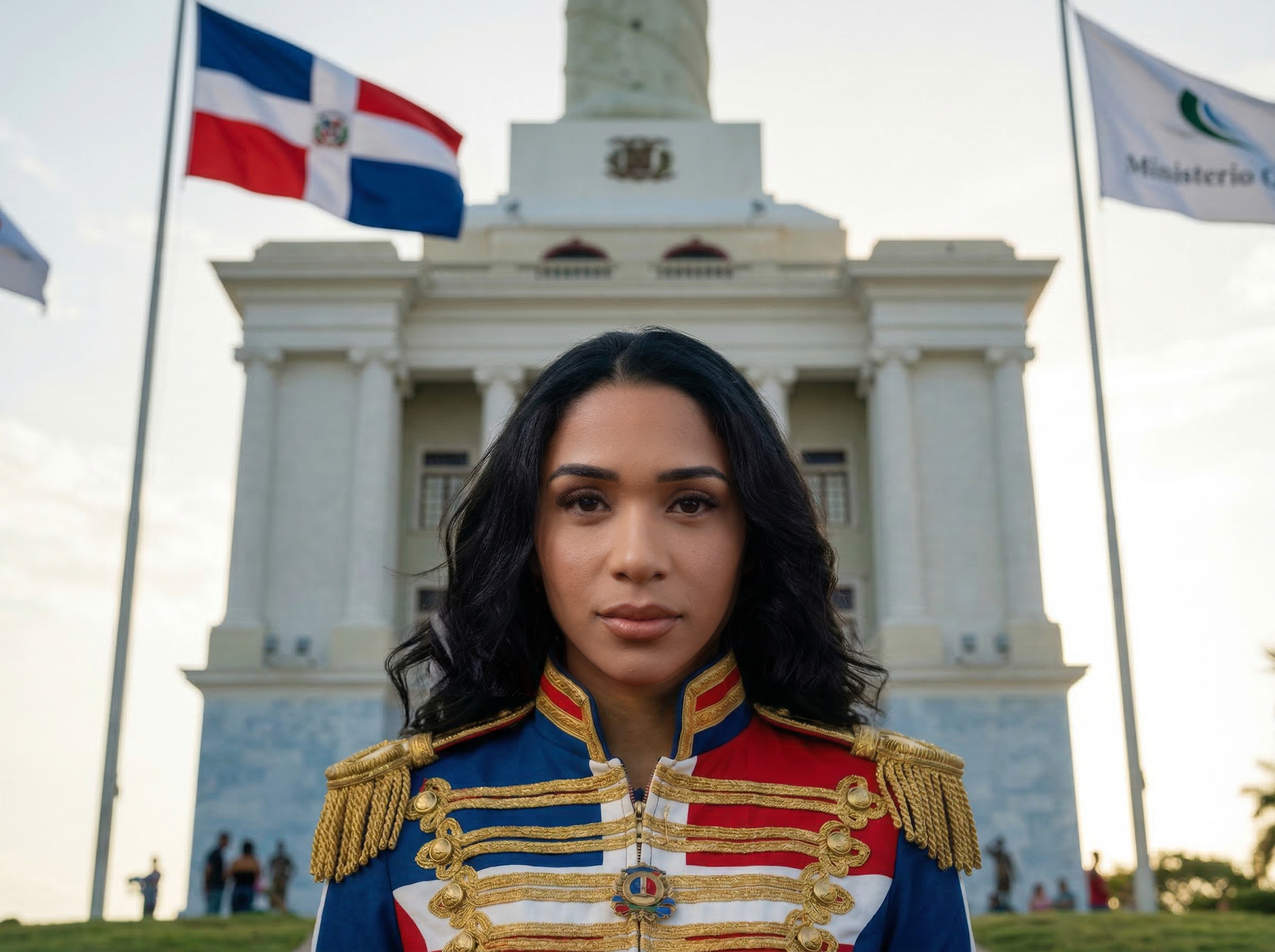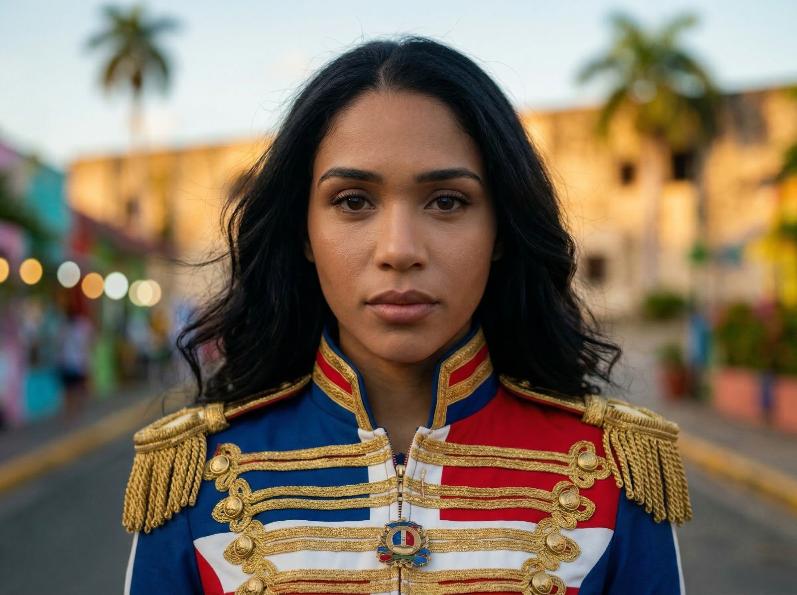 En esta pieza, Steffany Constanza asume un rol que exalta la grandeza de la cultura dominicana. Ataviada con un traje de gala de corte militar, encarna la dignidad y el respeto frente a monumentos históricos como el Altar de la Patria y la Zona Colonial, reafirmando la soberanía del legado nacional.